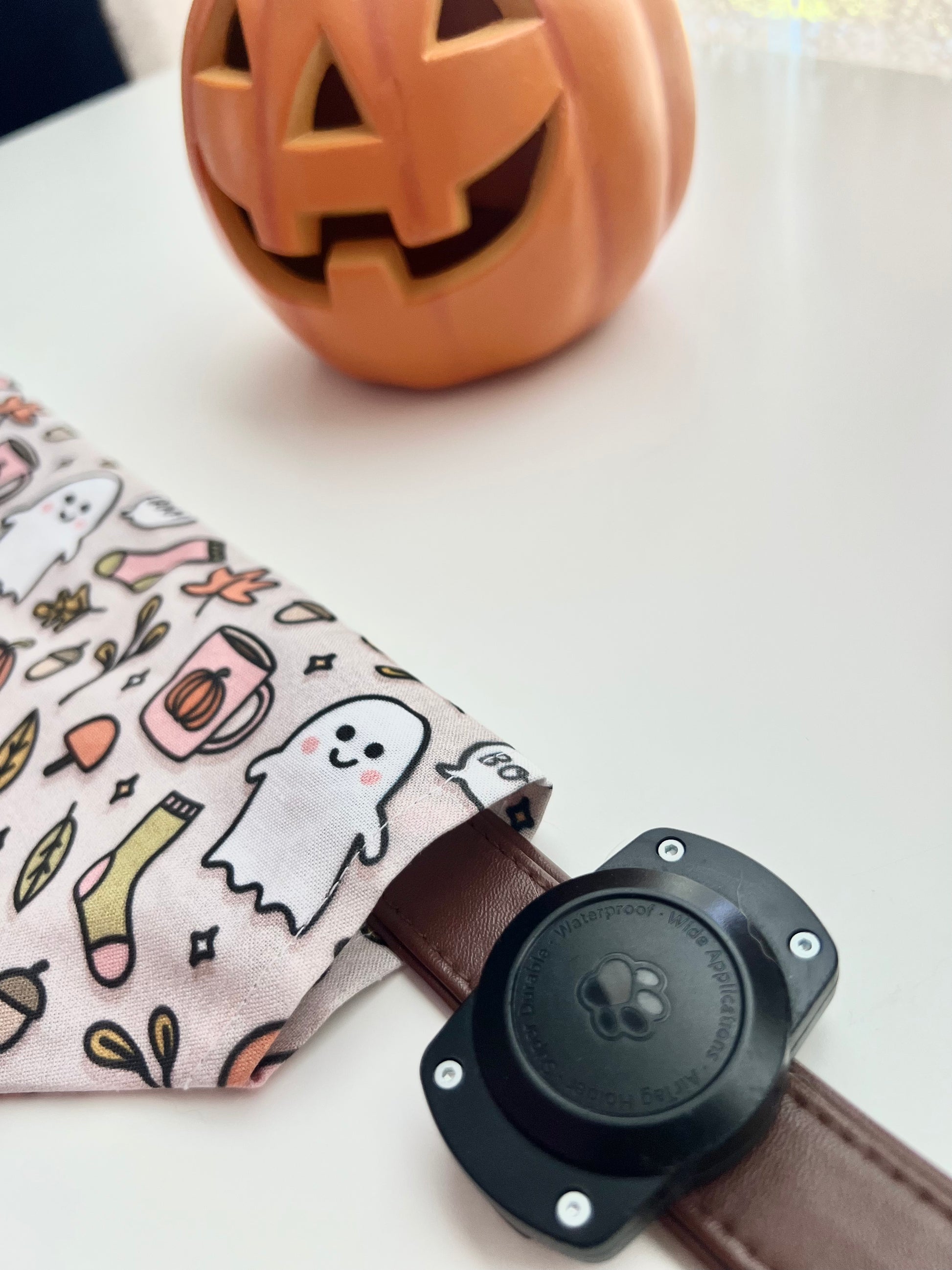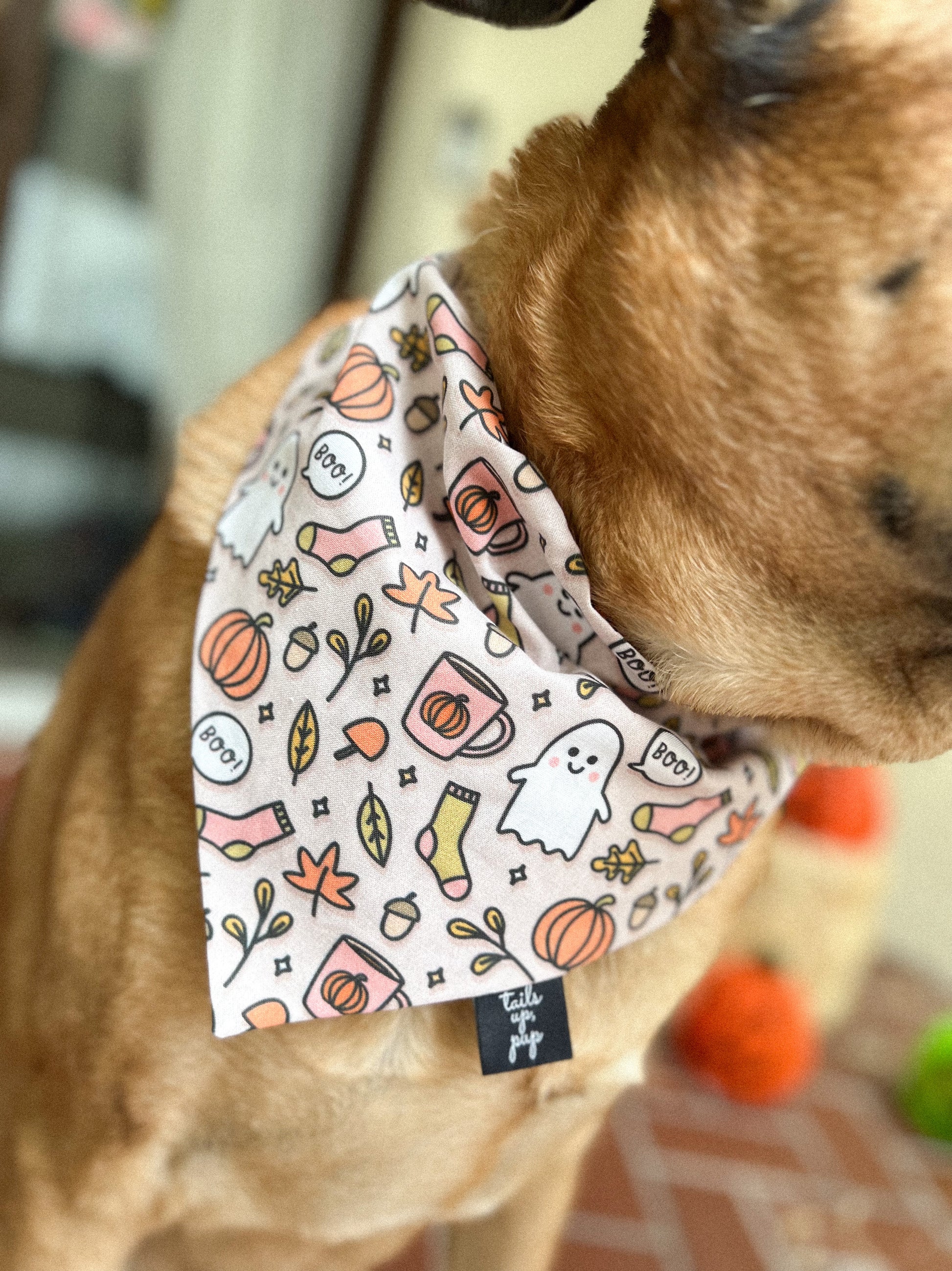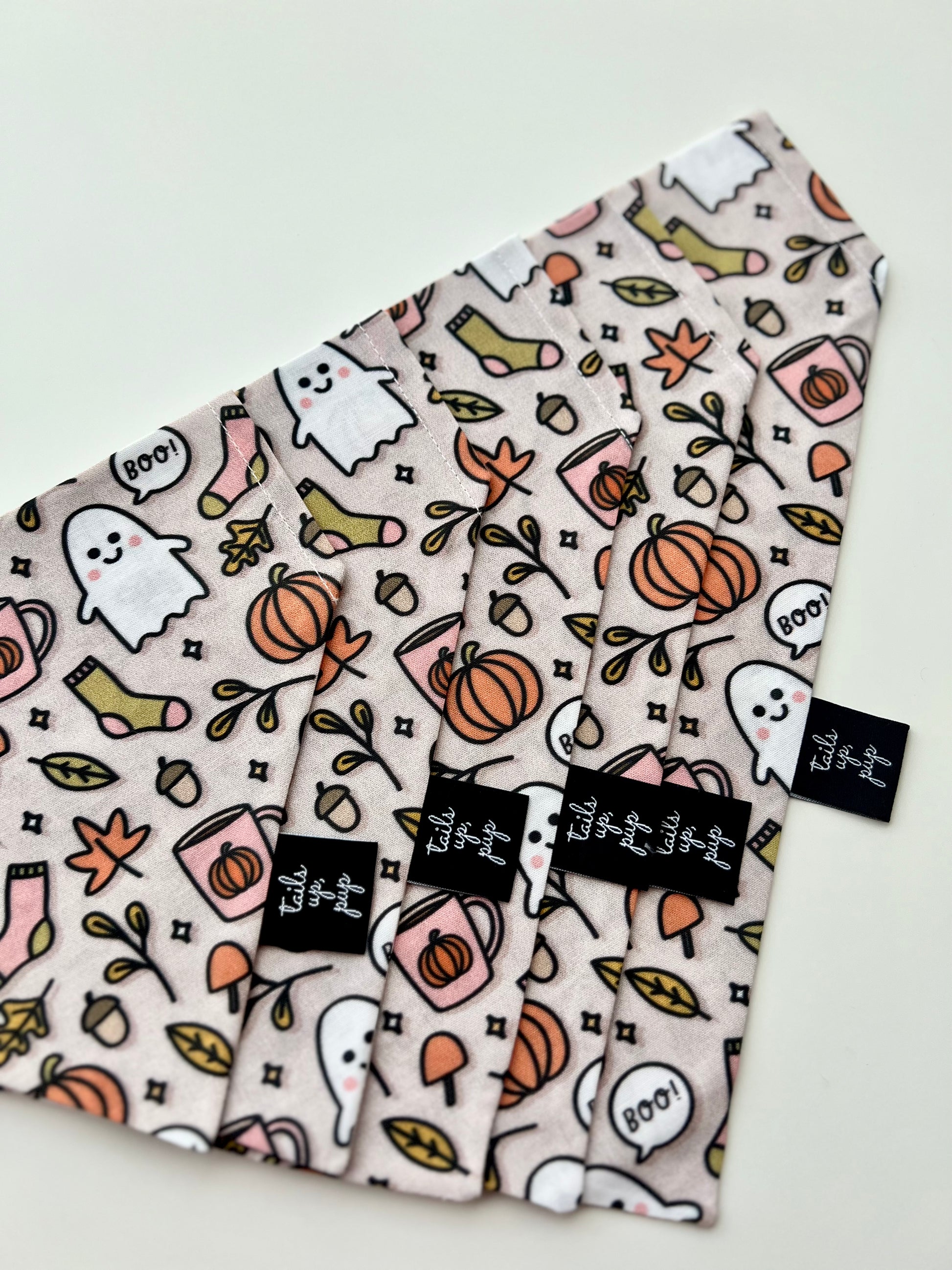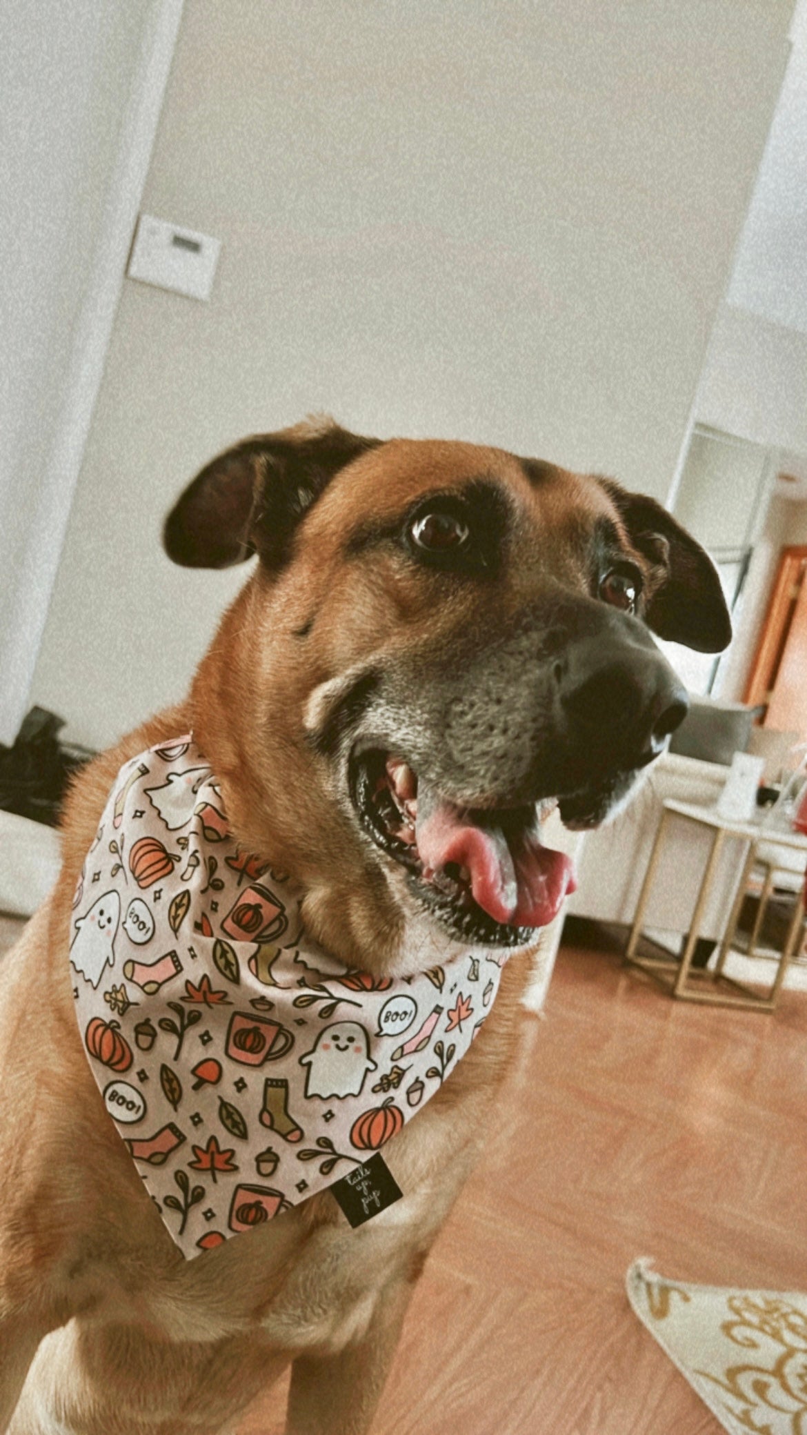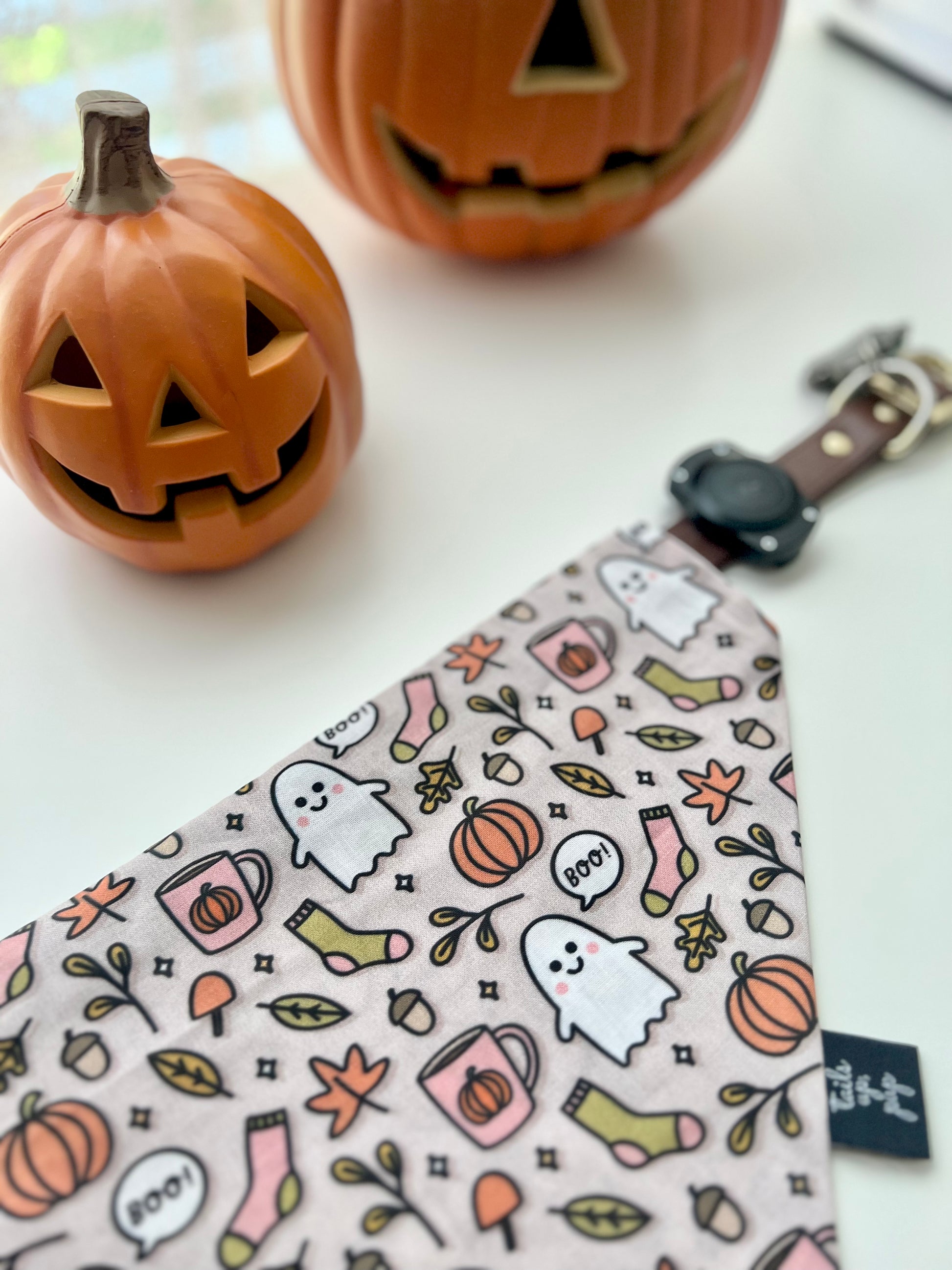 This adorable slip-on dog bandana features ghosts, leaves, and pumpkin lattes all over a neutral background.