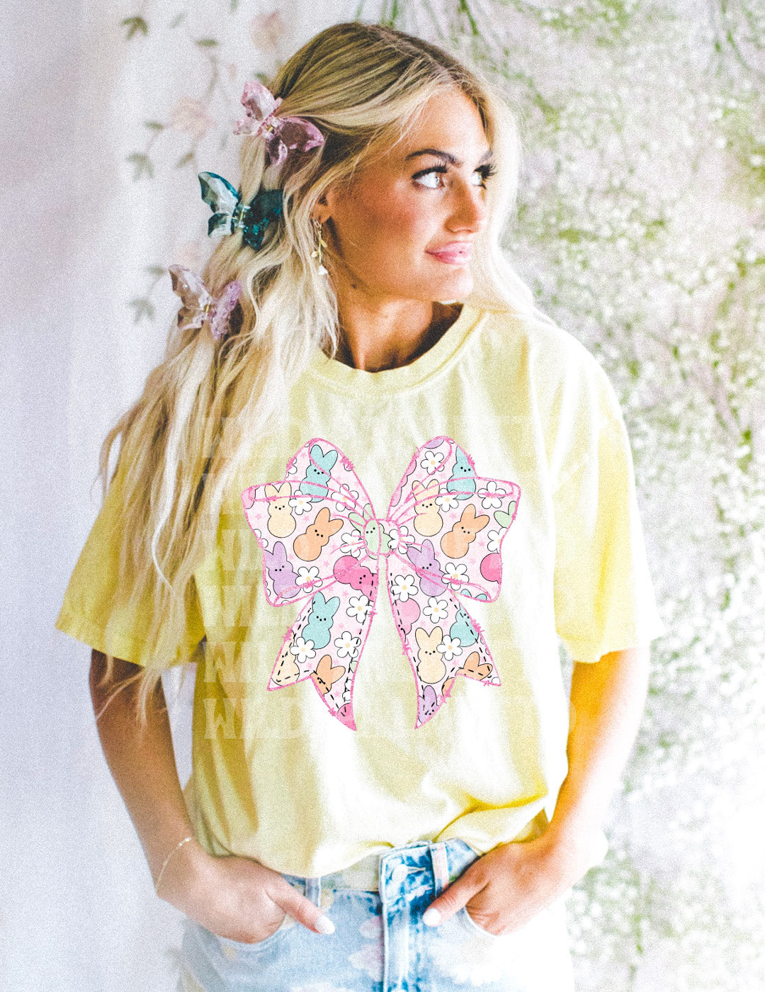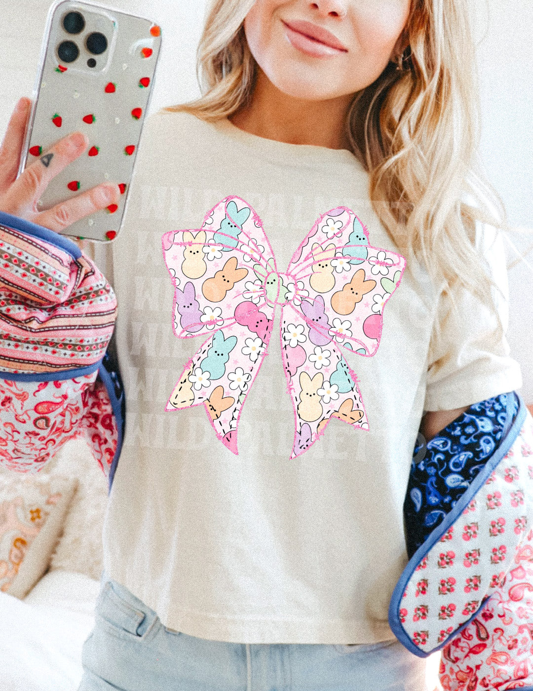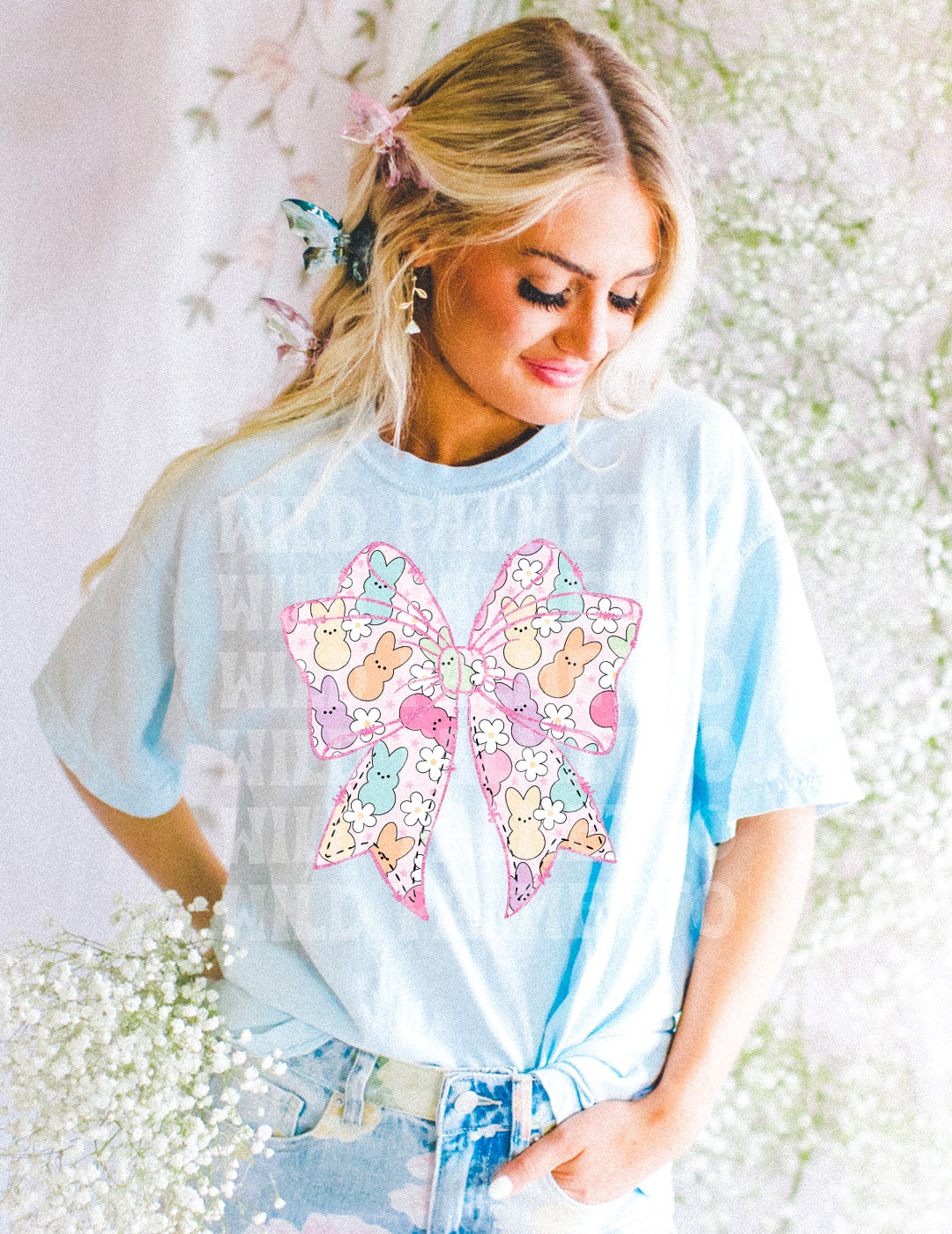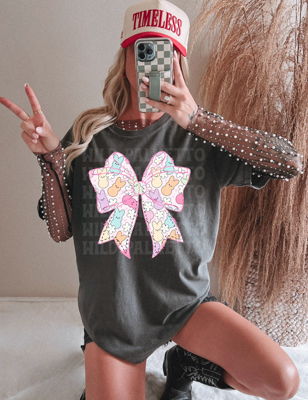 All graphics are direct to film prints. You can feel these prints, they are not printed directly on the garment. There may be slight variances since all items are hand crafted. *The outline of the bow has a faux glitter effect, there is no real glitter on the design*
