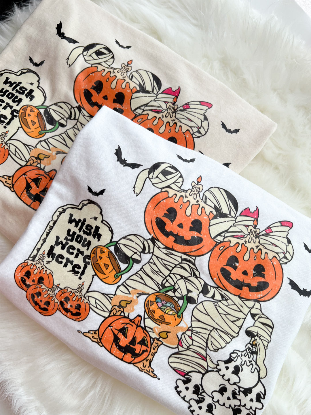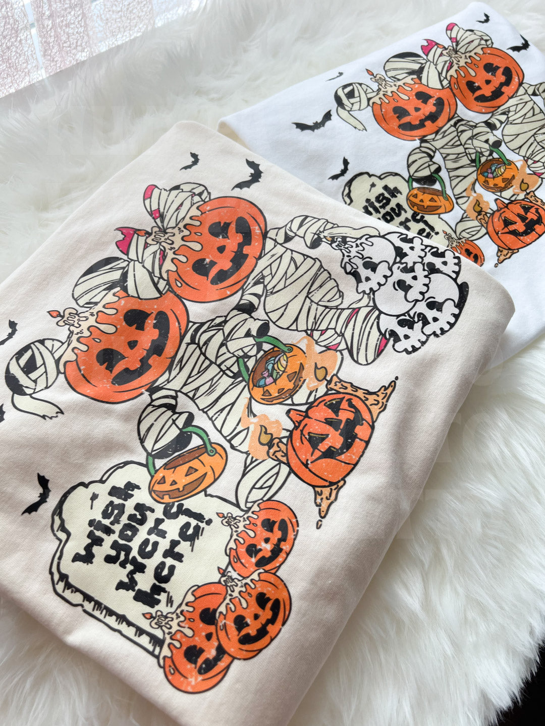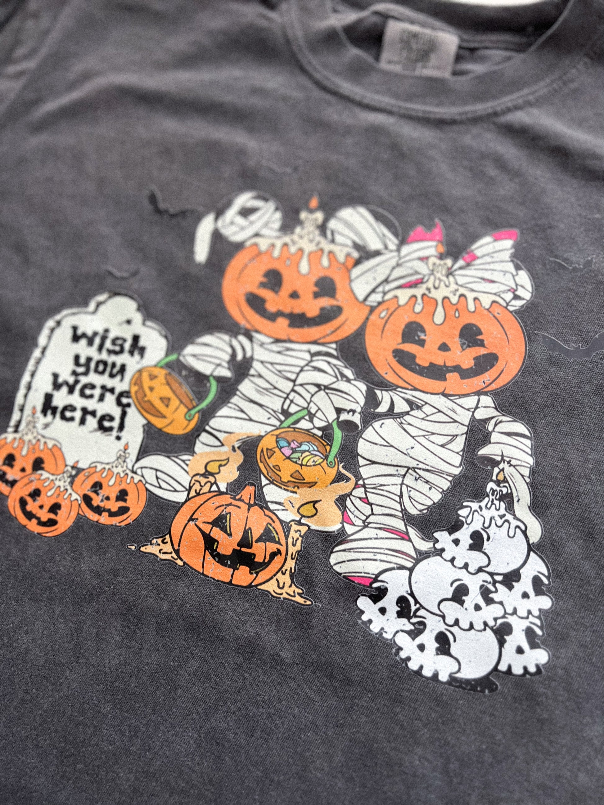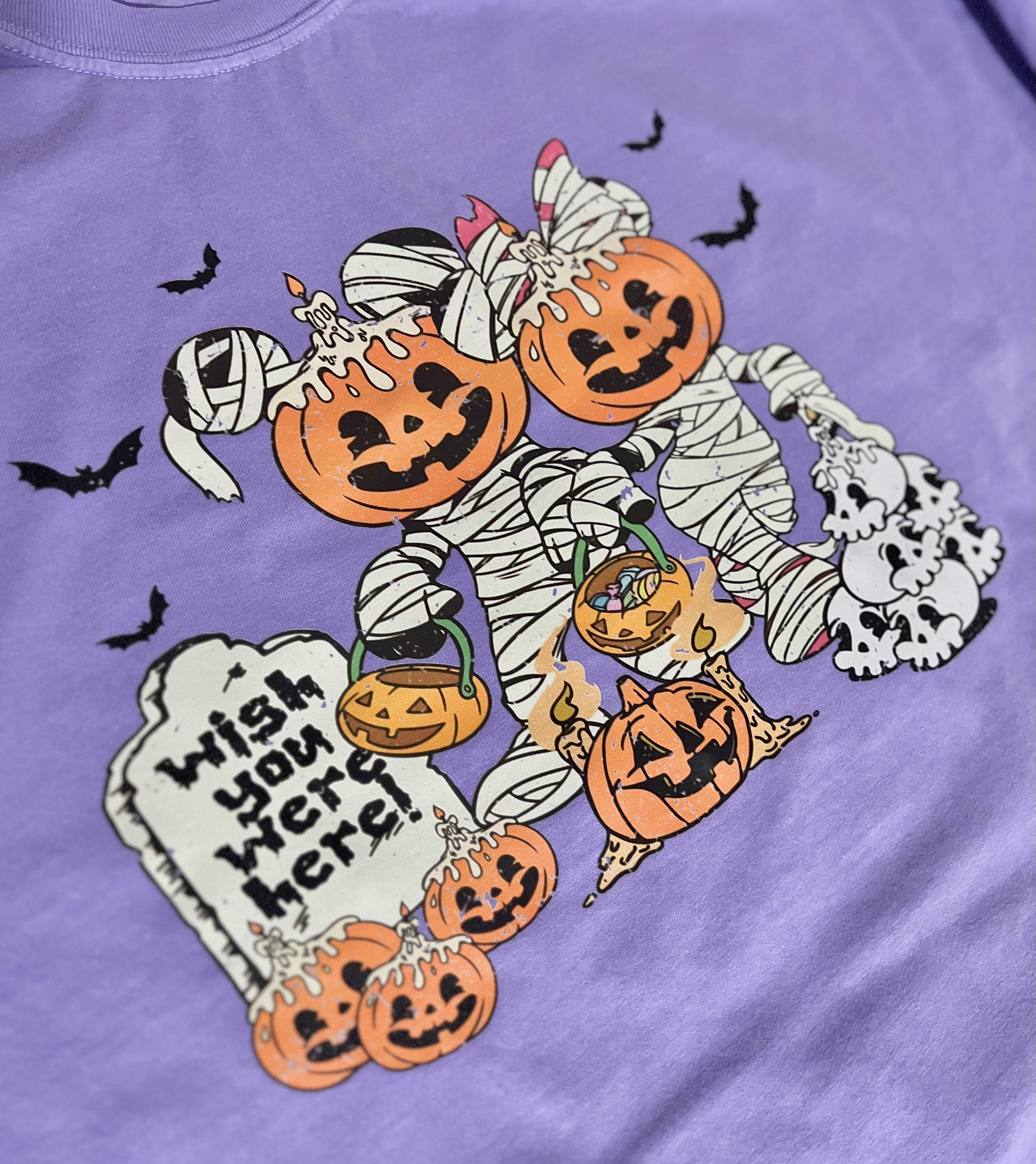All graphics are direct to film prints. You can feel these prints, they are not printed directly on the garment. There may be slight variances since all items are hand crafted.